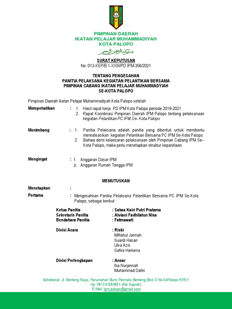 356 013 Sk Panitia Pelaksana Pelantikan Cabang Ipm Se Kota Palopo Pdf